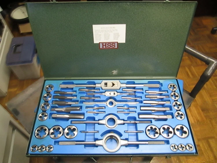 <p>45pcs Tap And Die Set High Speed Steel, 20 Thread Sizes, See DescriptionMade In Japan 45 Pcs Set Of Taps And DiesNational Course And Fine Thread SizesCondition: Looks New, Barely UsedHigh Speed Steel <br/>No Imperfections"Complete Combination Set Includes One Of Each Plug Tap and die for the following 20 thread sizes: 5/16"-18NC3/8"-24NF1/2"-13NC9/16"-18NF3/4"-10NC7/8"-14NF1/4"-20NC5/16"-24NF7/16"-14NC1/2"-20NF5/8"-11NC3/4"-16NF1"-8NC 1/4"-28NF3/8"-16NC7/16"-20NF9/16"-12NC5/8"-18NF7/8"-NC1"-14NS2 Tap Wrenches 3 Die Wrenches Asset In Stock And Available Immediately</p><br/><br/><p></p>