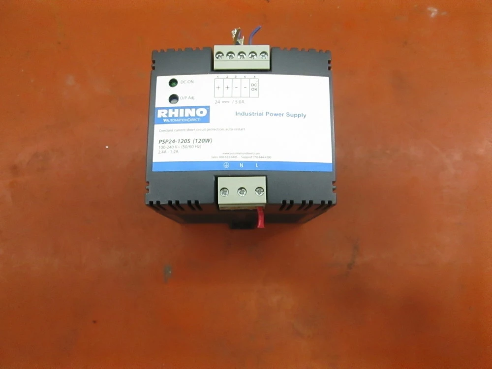 <p>Automation Direct PSP24-120S Switching Power Supply, 24-28VDC Output, 5AMake: Automation Direct Model: PSP24-120SCondition: Used, Overall In Great Shape Rhino Select PSP Series Switching Power Supply 24-28 VDC Single Output5 Amp Output Power: 120WNominal Input Voltage: 120/240 VAC or 85-375 VDCNumber Of Input Phases: 1Protections: Overvoltage, short circuit, Overload Mounting: 35mm DIN Rail or Chassis2 Available</p><br/><br/><p></p>