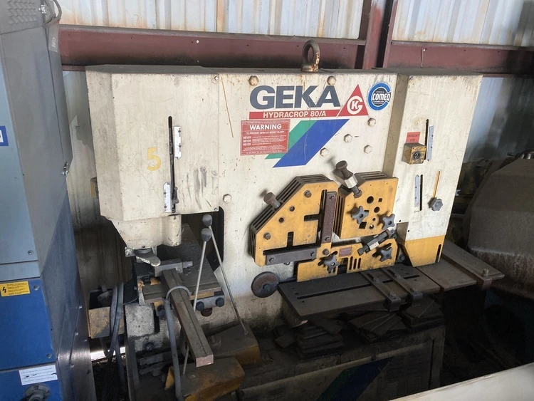 <p>Geka Hydracrop 80/A Hydraulic IronWorker New 1995 Make: Geka Model: 80/ASerial No: 7394Condition: Used Overall In Great Shape, Runs GreatComes With Lots Of Tooling Angle Iron- 5-1/2" x 5-1/2" x 1/2" Thick MaxFlat Stock- 18"w X 5/8" Thick MaxRound- 1-3/4" Diameter MaxSquare- 1-3/4" MaxHole Punch - 1" Diameter x 9/16" Thick Max<br/>Machine power requirement:480 volts, 3 phase, 9.3 KwOverall Dimensions: 6Ft Wide, 5Ft Long, 6Ft Tall Weighs Around 6500 LBSAsset In Stock And Available Immediately<br/><br/>Info from the Geka website:Geka Hydracrop 80 is an ironworker machine that can do punching, notching, angle cutting and shearing tasks. It is part of Geka´s two-cylinder Ironworker machines series called Hydracrop.</p>