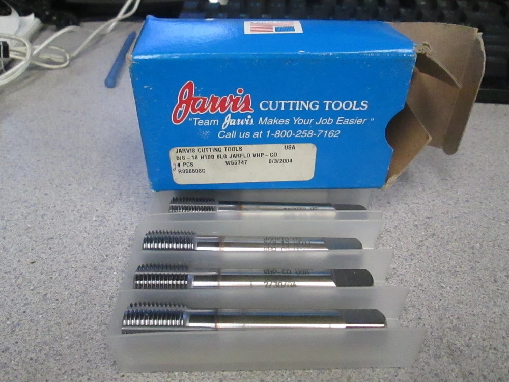 <p>Jarvis Cutting Tools 5/8-18 H10B 6LG JARFLO VHP-CO Made In THE USAMake: Jarvis Cutting ToolsModel: H10B 6LG JARFLO VHP-COCondition: New Quantities: Packs Of 6, 13 Of Them$25 Each $290 For All Of themTap Size: 5/8 - 18HSS Tap Year New: 200413 in Stock And available Immediately</p><br/><br/><p></p>