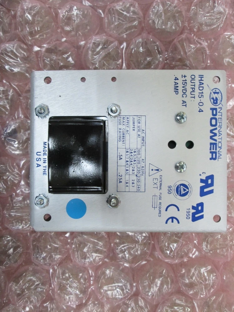 <p>&nbsp;&nbsp;&nbsp;&nbsp;Make: International Power<br/>&nbsp;&nbsp;&nbsp;&nbsp;Model: IHAD15-0.4<br/>&nbsp;&nbsp;&nbsp;&nbsp;Input Volts: 100,120,220,230/240<br/>&nbsp;&nbsp;&nbsp;&nbsp;Input Hz: 47-63<br/>&nbsp;&nbsp;&nbsp;&nbsp;Max Current Fuse Rating: .5 Amp For 100,120V/.25 Amp For 220,230/240V<br/>&nbsp;&nbsp;&nbsp;&nbsp;Output: ±15 Vdc At .4 Amps<br/>&nbsp;&nbsp;&nbsp;&nbsp;Made In Usa<br/>&nbsp;&nbsp;&nbsp;&nbsp;Asset In Great Overall Condtion<br/>&nbsp;&nbsp;&nbsp;&nbsp;Tested<br/>&nbsp;&nbsp;&nbsp;&nbsp;Sold As Is</p><br/><br/><p></p>