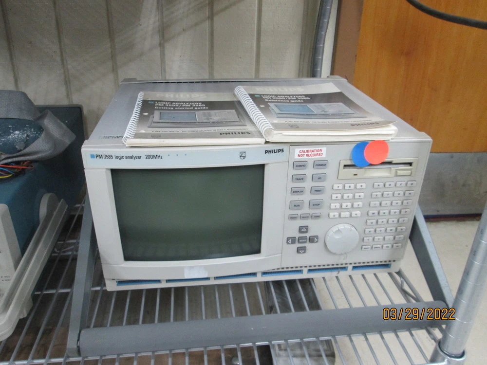 <p>Phillips Logic Analyzer PM3585, 20-0 MHz, 96 State/Timing Channels Make: PhillipsModel: PM3585Serial No: DA569801Condition: Used Overall In Great Shape96 state/timing channelsTiming analysis up to 200 MHzState analysis up to 50 MHzGlitch capture down to 3 nsSix 16 Channel PodsData Memory: 2Kb/ChannelProbe Impedance: 200k O/7 pFThresholds Per 8 ch: TTL, ECL or Variable Threshold Accuracy: 150 mV or 3% of selected threshold value, Which Ever Is GreaterMinimum input overdrive: 250 mV or 25% of swing, which ever is greaterMinimum Swing: 500 mVMaximum Input Voltage: +/-50 V peakChannel to channel skew: <4 nsUnique dual-analyzer-per-pin architecture combined state and timing date in a single acquisitionMs/Dos utilities For Graphics and postprocessing Display Modes: single screen or dual screen. Each screen section can contain data of and type of source Data type: Timing waveform or state list Data source: new measurement, reference measurement or comparison of new and reference measurementsDisplay labels: any label defined in format, displayed in any order. also relative to trigger point and/or time difference and clock (state lists)level display: Current levels in trigger sequence are displayed Measurement cursors: R and SAsset In Stock And Available Immediately</p><br/><br/><p></p>