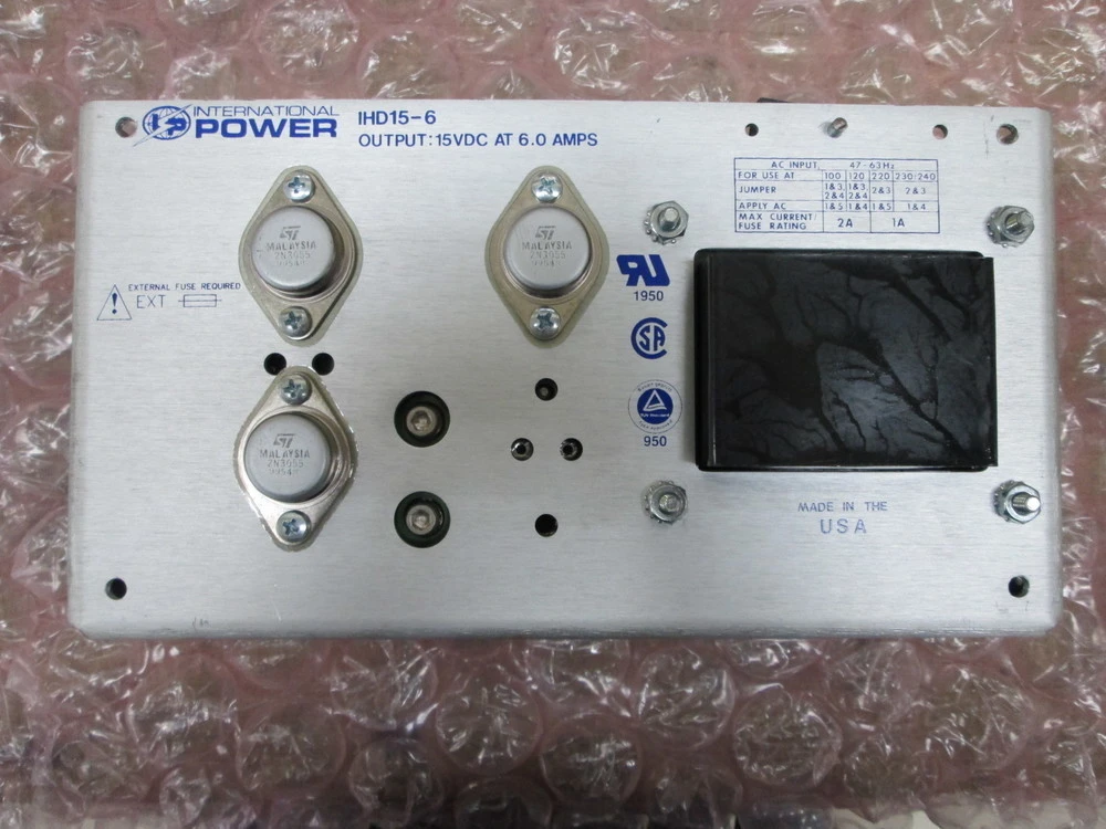 <p>&nbsp;&nbsp;&nbsp;&nbsp;Make: International Power<br/>&nbsp;&nbsp;&nbsp;&nbsp;Model: IHD15-6<br/>&nbsp;&nbsp;&nbsp;&nbsp;AC Input: 47-63 Hz<br/>&nbsp;&nbsp;&nbsp;&nbsp;For Use At: 100,120,220,230/240<br/>&nbsp;&nbsp;&nbsp;&nbsp;Max Current Fuse Rating: 2A/1A<br/>&nbsp;&nbsp;&nbsp;&nbsp;Output: 15 Vdc At 6 Amps<br/>&nbsp;&nbsp;&nbsp;&nbsp;Made In Usa<br/>&nbsp;&nbsp;&nbsp;&nbsp;Asset In Great Overall Condtion <br/>&nbsp;&nbsp;&nbsp;&nbsp;Tested <br/>&nbsp;&nbsp;&nbsp;&nbsp;Sold As Is</p><br/><br/><p></p>