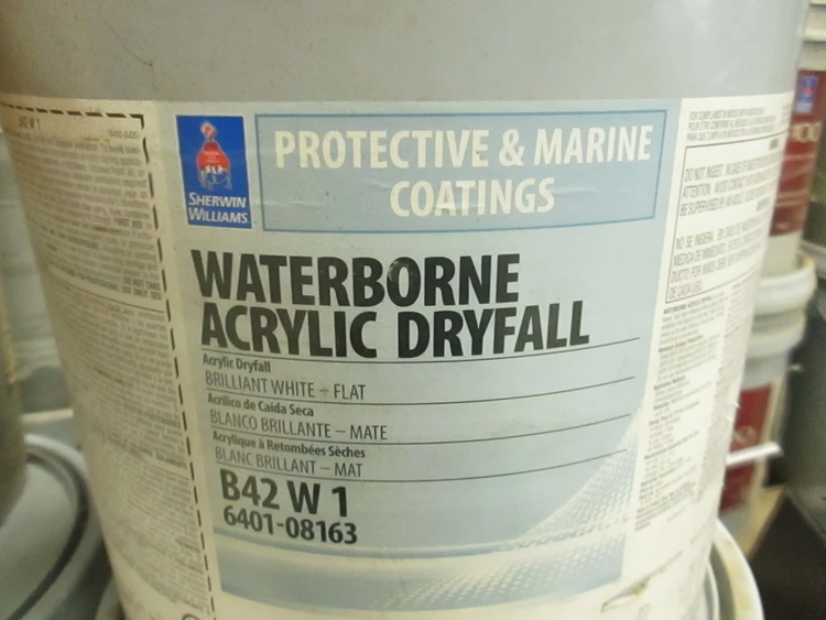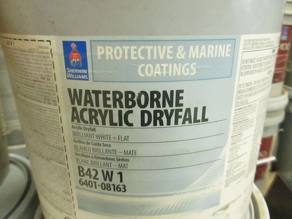 <p>Waterborne Acrylic Dyrfall B42-W-1, Brilliant White+Flat, 6401-08163, Make: Sherwin WilliamsModel: B42-W-16402-08163Protective Marine CoatingsWaterborne Acrylic Dryfall Brilliant White + Flat5 Gallon Buckets Photos Have Label Information 10 Count Of Them$150 EachIn Stock And Available Immediately$1300 For All 10</p><br/><br/><p></p>