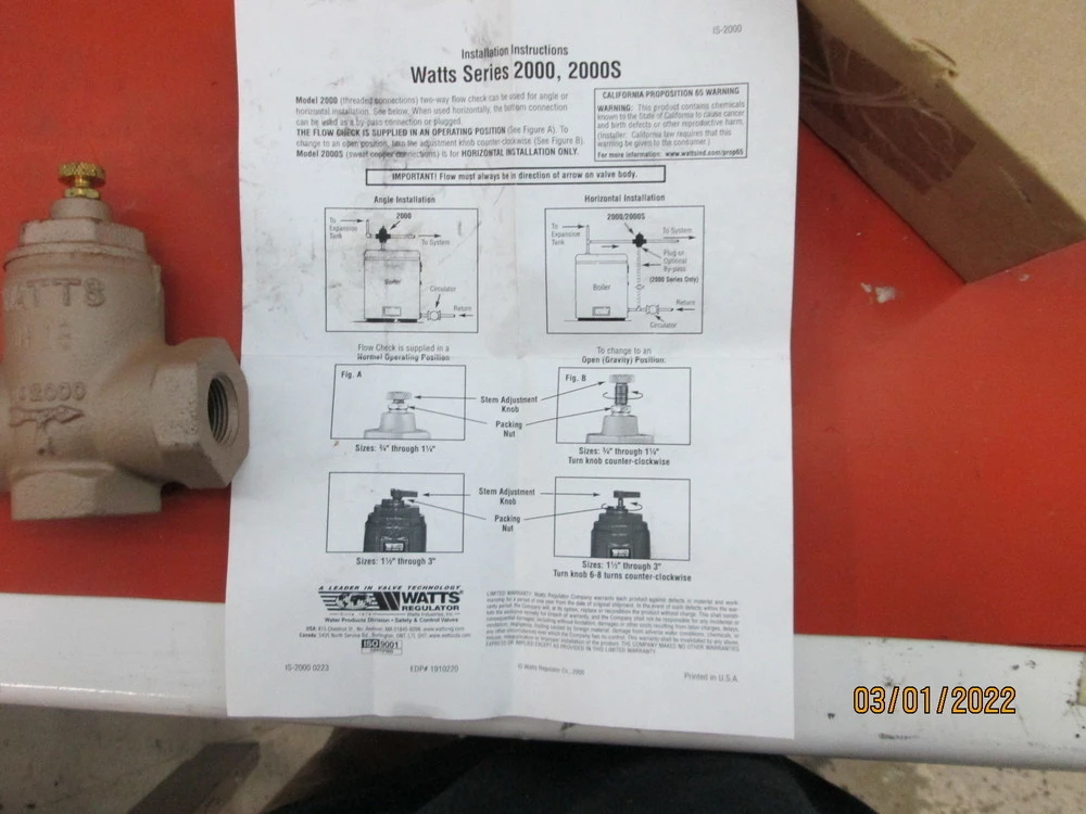 <p>Watts 3/4" 2000-M5 Control Valve 3 Way Max PSI 50Make: Watts Model: 2000-M5Serial No: 0950681Condition: Used, Overall Like NewProvides Positive Gravity ShutOffUsed In Forced Hot Water Heating SystemsProtects Radiation UnitsMax PSI: 50Easy InstallOverview- The hydronic two way universal flow check valve is used in commercial and residential hydronic heating systems to provide positive shut off when the circulator is not running preventing the flow of water to radiation units. it is easy opened for gravity circulation. the body is made of iron, with female threaded connections, a combination of angle and horizontal checks, bronze seat, and a brass cen4ter guide Asset In Stock And Available Immediately</p><br/><br/><p></p>