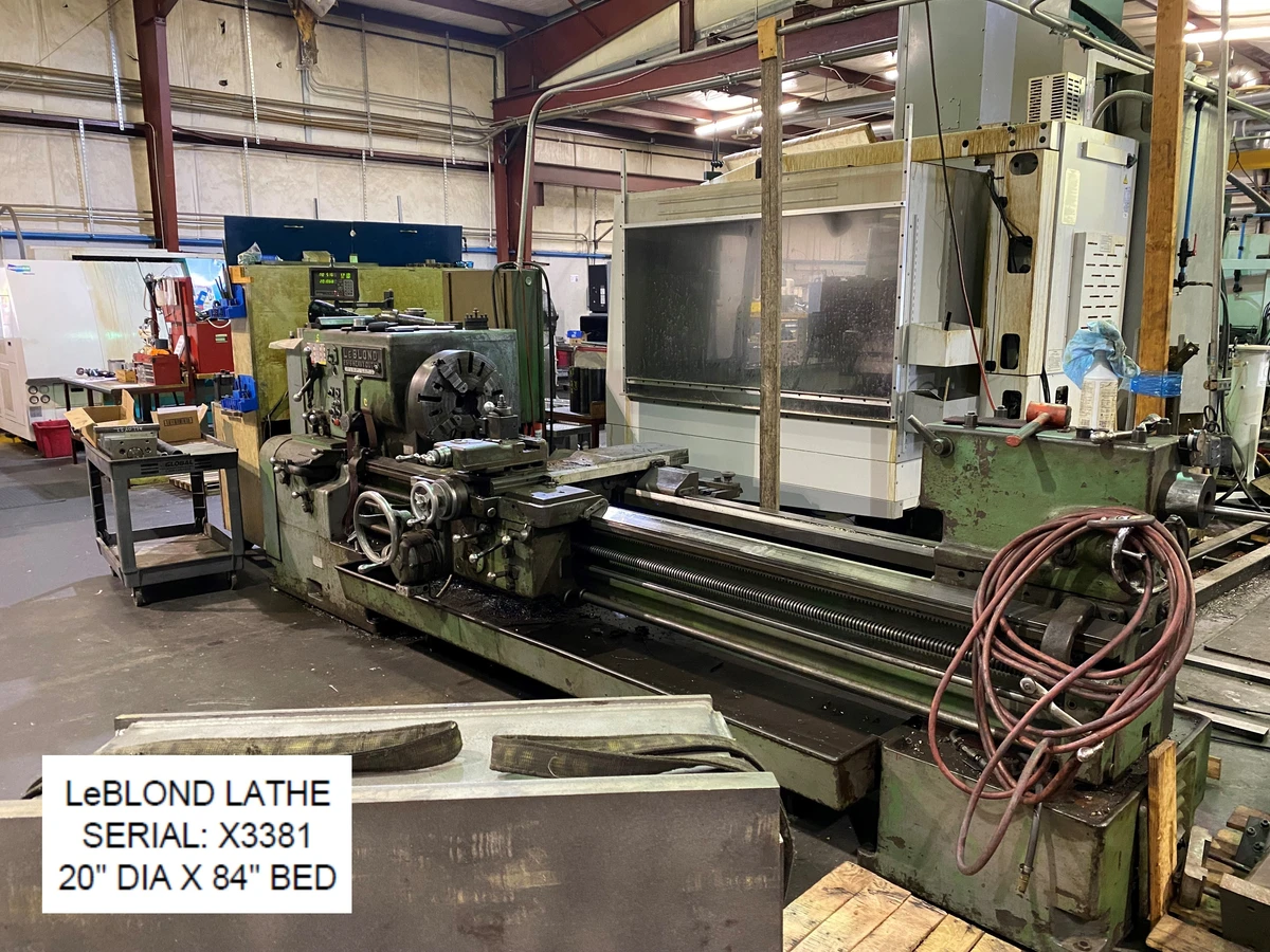 <p>20" x<br/>84"LEBLOND with a 2" spindle bore. Includes:Quick-change<br/>tool post20" diameter 4-Jaw ChuckTaper attachment, and a Newall 2-axis<br/>DRO. The DRO control works<br/>fine, but it needs a new Z-axis cable (longitudinal). The machine runs good,<br/>but has been moved from where it's shown in the picture, and it's no longer<br/>under power. They needed the space.<br/>Price is Loaded on truck and ships from Powder Springs, GA</p>