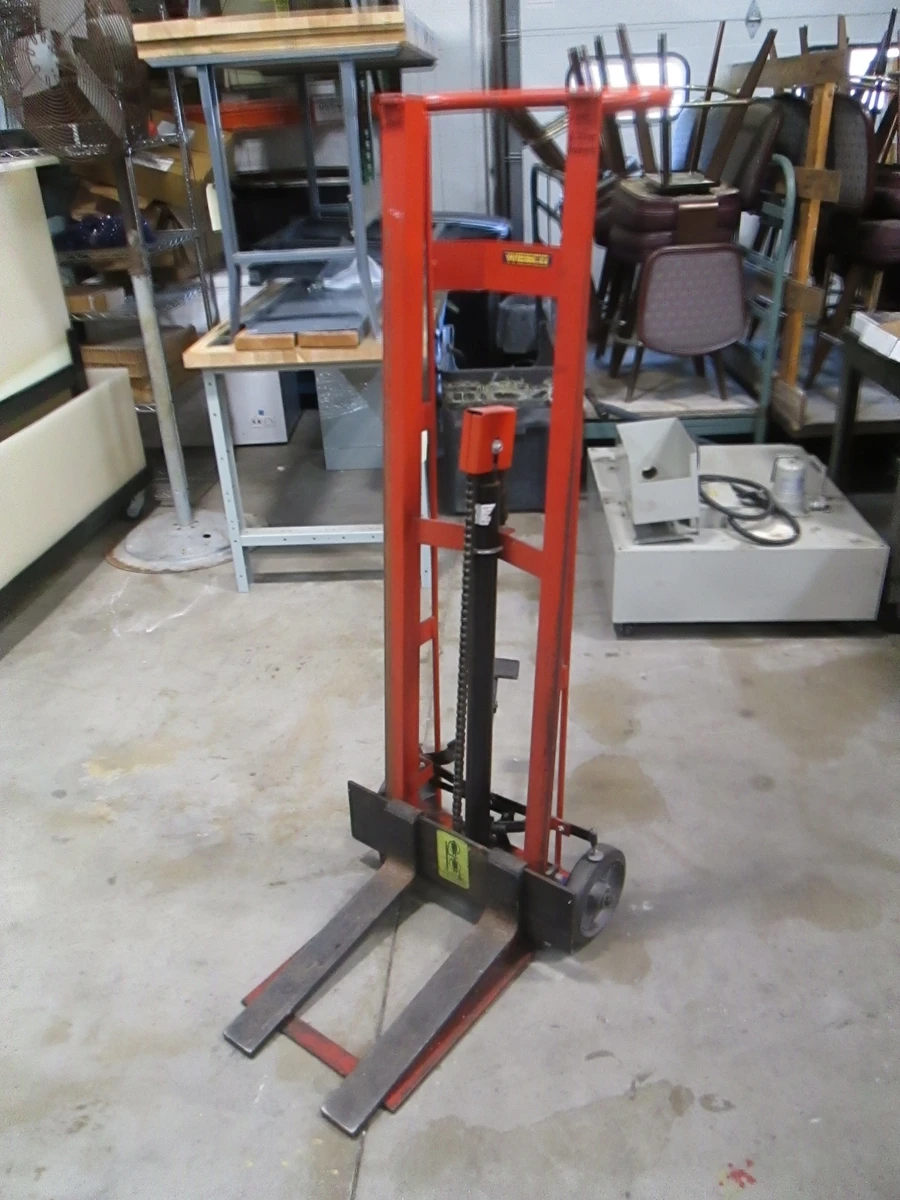 <p>Make: Wesco<br/>Model: PL-54-F<br/>Serial No: 149184<br/>Condition: Used, Overall In Great Shape, Works Great<br/>Steel Frame Construction<br/>Made In USA<br/>Weight Capacity: 750 Lbs<br/>Wheel Size: 8"<br/>Wheel Type: Moldon Rubber<br/>Raised Height: 54"<br/>Manual Operation<br/>Cubic Ft: 25.21<br/>Handle Type: Continuous<br/>Floor Wheel Lock Standard<br/>Load CTR: 9<br/>Forks: 18"x3"<br/>Front Tip Of Nose Plate Touches Floor<br/>Asset In Stock And Available Immediately</p>