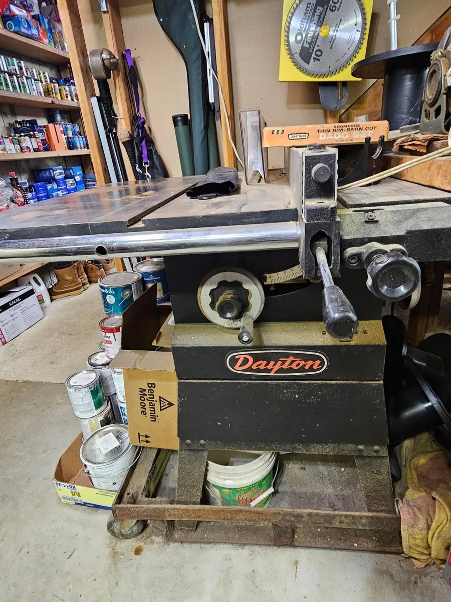 <p>Old Dayton Table Saw<br/>10" / 12" Blade<br/>Contractors saw<br/>Comes with Fence and Dado Set</p>