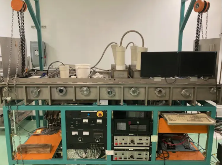 <p>-Two Magnetron Sputtering Sections and one laser Ablation Section<br/>-Deposits Multiple Film layers in one vacuum pump down<br/>-Special feeder cart loads substrates, transported via programmable drive<br/>-Configurable for multiple smaller wafers or large plates (up to 20" diagonal)<br/>-User Spectron 3000 mJ ND - Laser for ablating high purity graphite, producing films from graphitic to diamond like carbon.<br/>-Sputtering Sections compatible with targets ranging from smaller rounds to 20" rectangular (includes Cr, ITO, Mo, W, Al, Cu)<br/>-Chamber Dimensions: 8ft Long with space for an additional section (e.g plasma etch)<br/>- Top opens with a manual chain hoist for easy target changes and cleaning<br/>- comes with CryoTorr 10 pump and chiller</p>