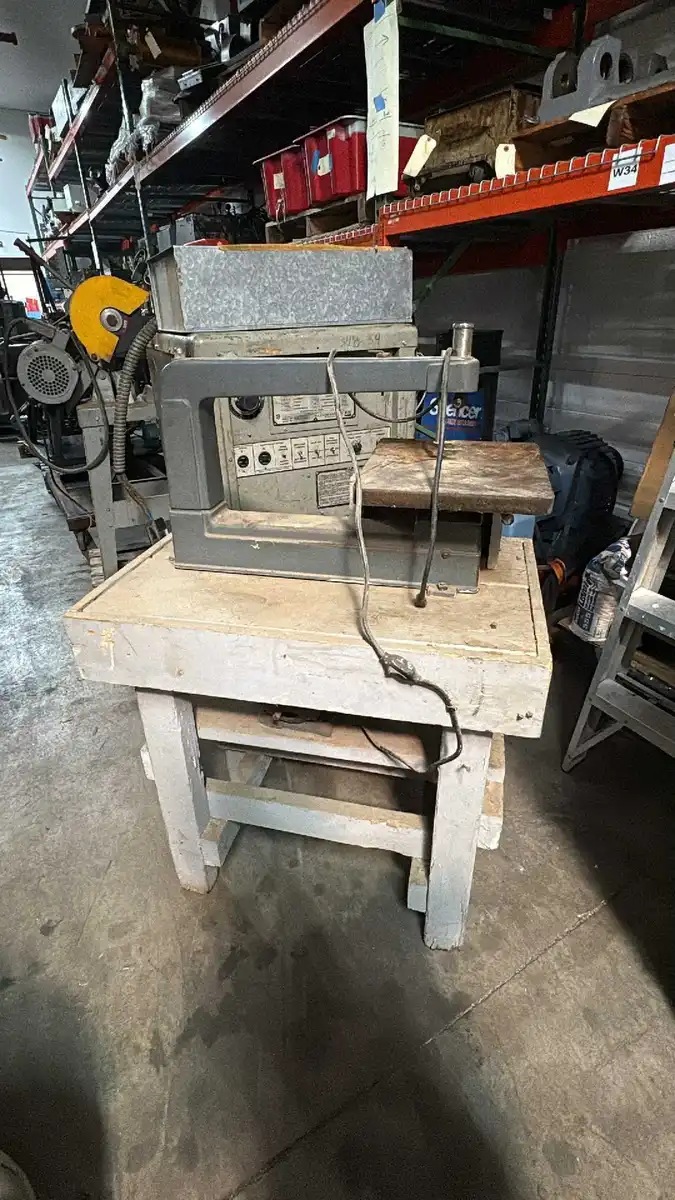<p>18" Scotch - Yoke Jig Saw<br/>Mounted on Custom Wooden Table<br/>Made in the 1950s</p>